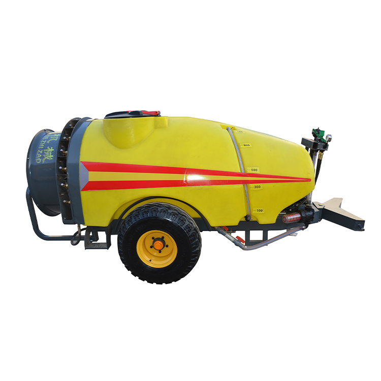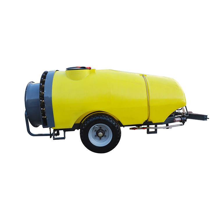 트랙터 미스트 블로워 분무기는 녹색 프레임과 노란색 대용량 탱크를 갖추고 있어 눈에 띄는 색상 대비를 만들어 현장을 쉽게 식별하고 유지 관리할 수 있습니다. 이 장비의 전면부에는 강력한 공기를 생성하는 다중 블레이드 디자인이 특징인 금속 보호 메쉬 커버가 있는 대구경 축류 팬이 장착되어 있습니다. 후면 섹션은 직사각형 모양의 노란색 PE 재료 탱크로 구성되어 있으며 상단에 충전 포트가 있고 측면에 관찰 창 또는 유지 관리 해치가 있습니다. 중간 및 하단 부품은 고압 펌프, 파이프라인 시스템, 제어 밸브 그룹 및 여과 장치와 통합되어 있어 명확한 파이프라인 레이아웃이 쉽게 구성되어 있습니다. 전체 트랙터 미스트 송풍기 분무기 장치는 녹색 스프레이 방청 프레임으로 지지되며 하단에 매달린 설치 브래킷이 있어 안전한 설치를 위해 트랙터의 3점 서스펜션 시스템에 직접 연결할 수 있습니다.